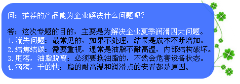 答:根據多年來接觸過的客戶來看,夏季30-40℃高溫+設備運轉的溫度,如果油脂選擇不很理想,就容易出現問題。 |