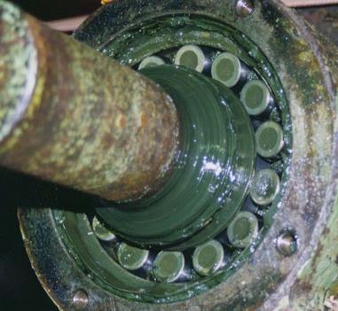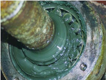潤滑脂成銹黃色呈膠體狀,并且軸承外圈明顯干涸變白,經(jīng)了解該潤滑脂原來顏色為黃色。可推斷在其然后過程中因軸承生銹,摩擦沒有得到很好的控制導(dǎo)致油脂和銹跡混合變色。
